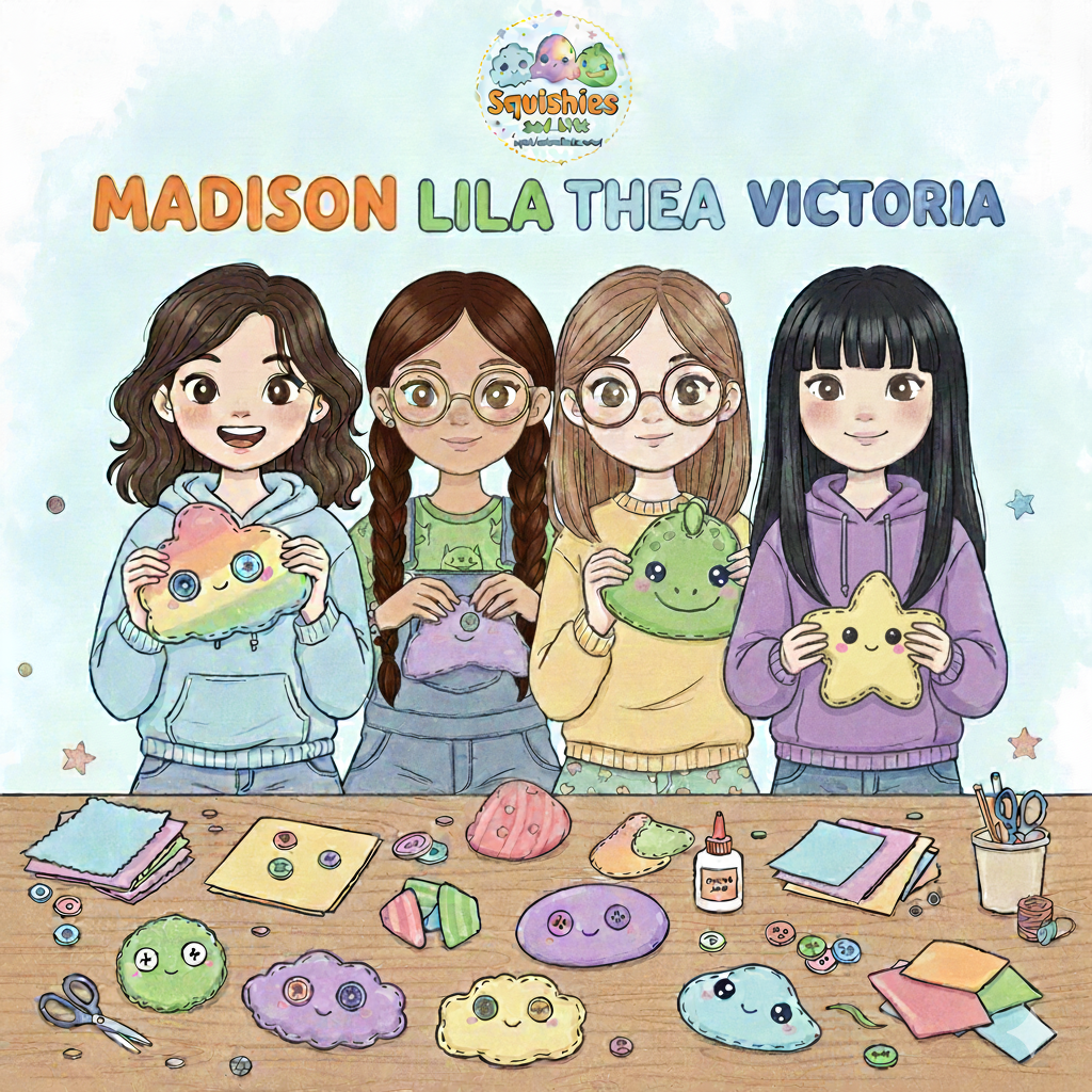 Welcome to Squishies and Bits! We are Madison, Lila, Thea, and Victoria....four best friends who love getting together to craft and create. We started this business because we adore making super-soft, custom squishies and wanted to share our handmade 'bits' of fun with you! Every squishy is stitched, stuffed, and decorated with love right here by us. We hope our squishies bring a smile to your face!